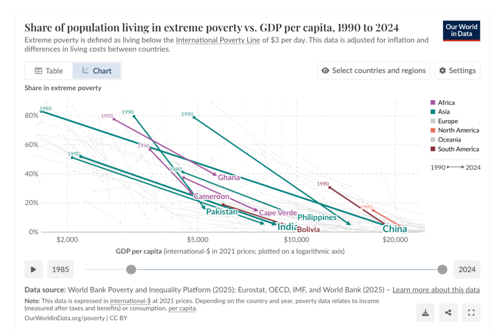 Share of population living in extreme poverty vs. GDP per capita, 1990 to 2024