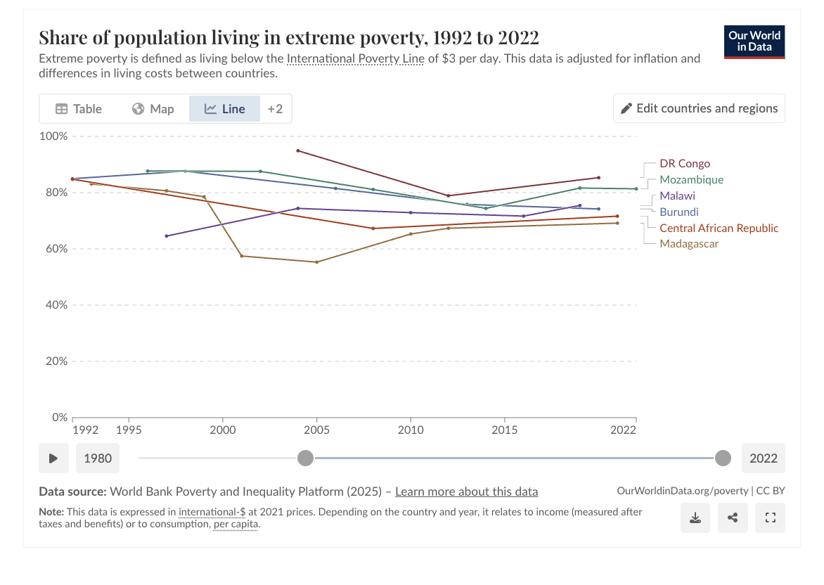 The situation is similar in other countries, as the chart below shows: in the Democratic Republic of Congo, Mozambique, Malawi, Burundi, and the Central African Republic, more than half of the population lives in extreme poverty. As their economies have stagnated, the deep poverty that most people live in has remained largely unchanged for decades.