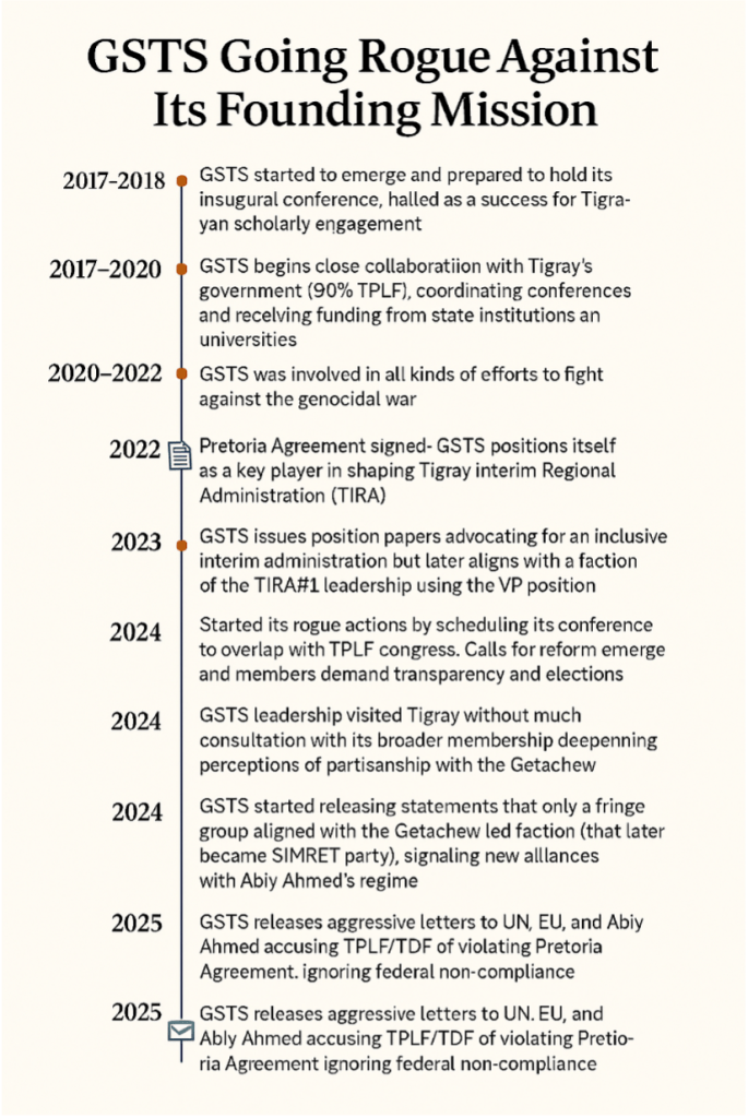 The Global Society of Tigray Scholars and Professionals (GSTS) was founded with a noble vision: to serve as a non-partisan, autonomous, and not-for-profit global knowledge network dedicated to building a resilient, knowledge-based society in Tigray and beyond. Its mission emphasized science, technology, innovation, research, policy development, and humanitarian work, anchored in transparency and inclusivity. However, GSTS has strayed far from these ideals. This article shows how GSTS evolved from a scholarly platform into a politically entangled entity, culminating in its current incarnation as a four people led GSTS, a faction accused of undermining Tigray’s sovereignty and justice efforts.