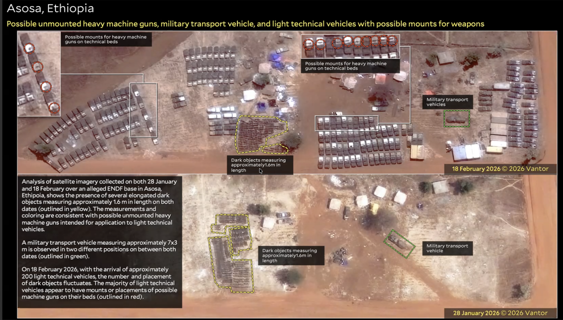 - Unarmed technicals are being retrofitted with gun mounts for heavy machine guns at base: In February 2026 satellite imagery, HRL observes some unarmed non-ENDF technicals with uniform gun mounts capable of holding heavy