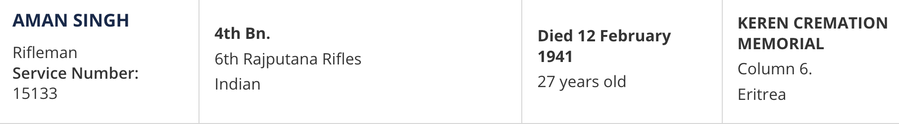 Many of the Indians died in the attack and are buried in Keren at the Commonwealth War Graves site. I have visited – years ago – and it was immaculately maintained. Here is the record of one of the 288 who laid down their lives (full list below.)